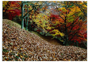 森林館近くの斜面では、もみじやかえでが、燃えるような赤や黄に染まっています。