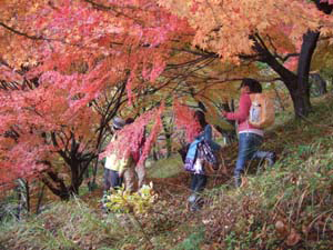 秋風の中を散策。紅葉の色を楽しみながらお茶のお点前を体験しよう。 |