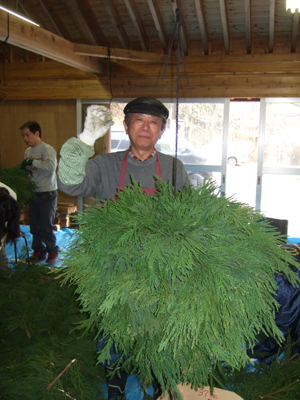 杉の葉で大きな玉を作り、お正月に飾ろう |