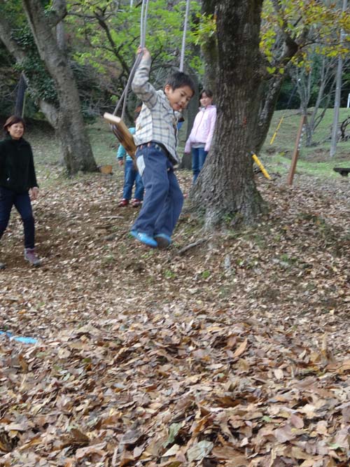 落ち葉のプールにダイブ!ブランコやターザンなど簡単なアスレチックにも挑戦!落ち葉を集めて焼き芋を作ってみんなでいただきます!